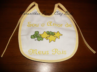 Babete amarelo com frase personalizada "Sou o Amor de Meus Pais" e Ratinhos nas estrelas Bordado a ponto cruz